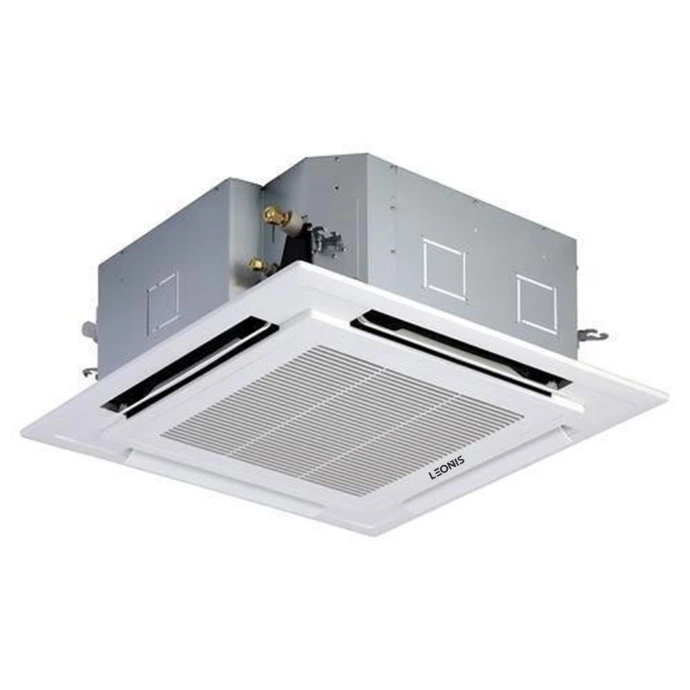 A cassette AC is a type of split air conditioner with its indoor unit installed centrally in the ceiling (often in a false ceiling) for discreet, space-saving cooling, distributing air in 2, 3, or 4 directions for uniform coverage, making it ideal for large commercial spaces or modern homes where wall-mounted units aren't desired, with the noisy compressor remaining outside.